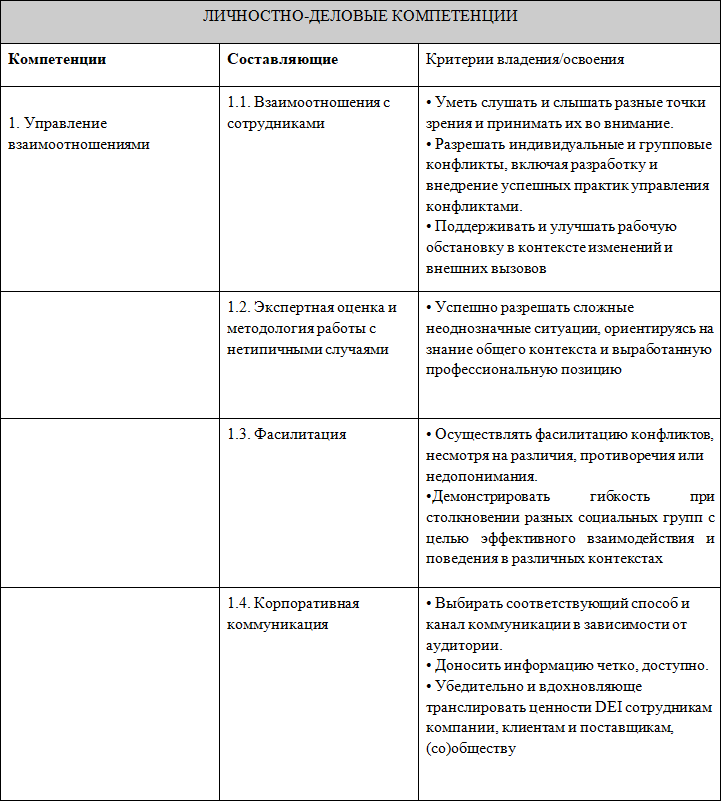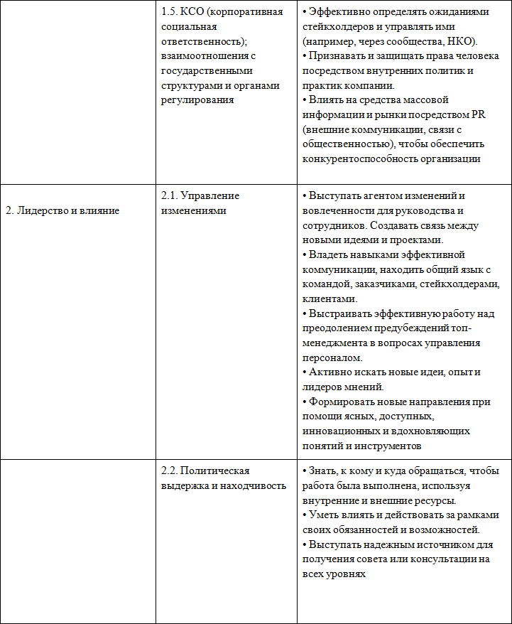 1. Знания в области управления персоналом. Включают знания о корпоративной культуре, ее принципах, моделях, способах оценки, стратегиях и методах формирования. А также знания об организационном развитии, умение способствовать изменениям в рамках организации, знание циклов работы сотрудников в компании: подбор персонала, вознаграждения, развитие талантов, их обучение, управление производительностью. Владение стратегиями привлечения и отбора кандидатов в соответствии с принципами DEI. Понимание принципов работы с программами компенсации, льготами, владение передовыми практиками. Разрешение трудовых споров и владение методологией отработки нетипичных случаев. Знания внешних факторов влияния и давления.