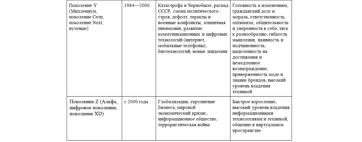 С этой же частотой в мире появляется новое поколение, которое воспитывается в ситуации, соответствующей конкретной стадии общественной среды, а значит, обладает набором ценностных характеристик, отличающимся от установок предыдущей поколенной группы вплоть до противоположности.