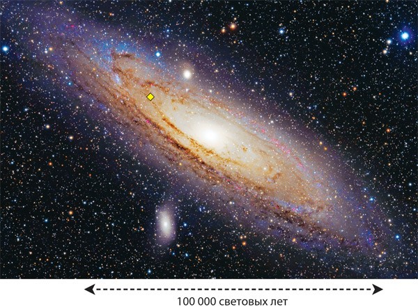 Ближайшая к нашей крупная галактика называется галактикой Андромеды (рис. 2.2), и находится она на расстоянии 2,5 миллиона световых лет от Земли. В ней около триллиона звезд, ее поперечный размер – примерно 100 000 световых лет. Млечный Путь и галактика Андромеды в некотором роде близнецы – они схожи по размерам, по форме и по количеству звезд. Если бы на рис. 2.2 был изображен Млечный Путь, Земля находилась бы там, где нарисован желтый ромбик.