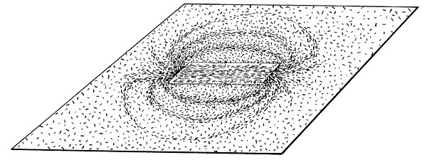 Рис. 2.6. Силовые линии магнитного поля вокруг магнитного бруска видны благодаря рассыпанным по листу бумаги железным опилкам (Рисунок Мэтта Зимета по моему наброску; из моей книги «Черные дыры и складки времени: дерзкое наследие Эйнштейна» [Торн 2009].)