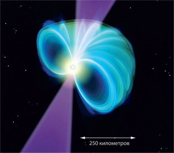 Магнитное поле нейтронных звезд очень мощное. Его силовые линии, так же как и земные, образуют фигуру, напоминающую пончик. Быстро движущиеся частицы, пойманные в магнитное поле нейтронной звезды, подсвечивают его силовые линии (голубые кольца на рис. 2.10). Некоторые частицы освобождаются и отлетают от полюсов, образуя конусообразные струи – джеты[15] (на рис. 2.10 показаны фиолетовым). Джеты состоят из самых разных излучений: гамма-лучей, рентгеновских лучей, ультрафиолета, видимого излучения, инфракрасного излучения, а также радиоволн. По мере того как звезда вращается, излучающие джеты движутся по небосводу подобно прожекторам. Каждый раз, когда джет поворачивается в сторону Земли, астрономы наблюдают импульс излучения; из-за периодичности импульсов такие звезды и прозвали пульсарами.