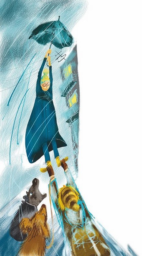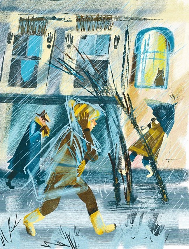 К ней приближался кто-то одетый в плащ до земли. Этот человек держался двумя руками за ручку зонтика, который всё норовил улететь к облакам. Из-за этого человеку некогда было смотреть под ноги и он спотыкался, скользил и попадал в самые глубокие лужи.