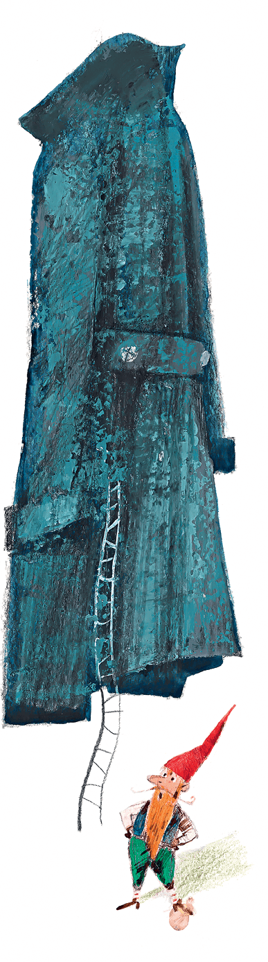 Из кармана черного пальто Кусандры, висевшего на вешалке, вылез моток веревки, веревка развернулась и превратилась в длинную лесенку до самого пола. Потом из кармана показалась маленькая голова в красном колпаке, и оттуда выбрался человечек ростом с чайник для заварки. Не заметив Алису, он начал быстро спускаться по лестнице. Лестница раскачивалась, человечек судорожно цеплялся за перекладины. Алиса протянула руку и придержала лестницу, чтобы он не сорвался.