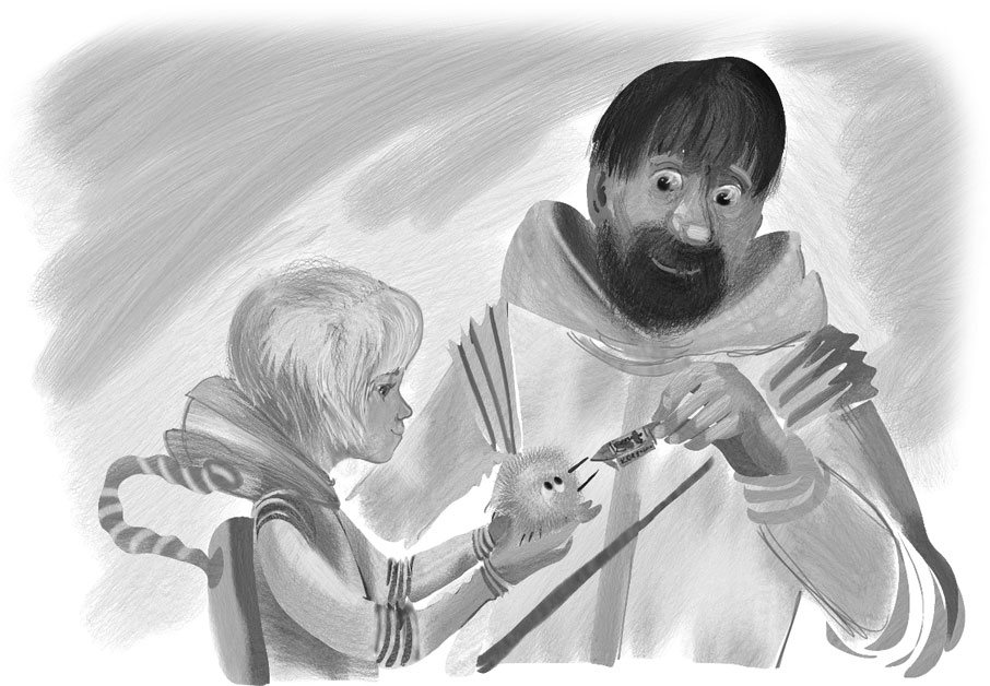 И Алиса осторожно достала из сумки маленького шестилапого зверька, похожего на кенгурёнка. У шушонка были большие стрекозиные глаза. Он быстро вращал ими, крепко вцепившись верхней парой лап в Алисин костюм.