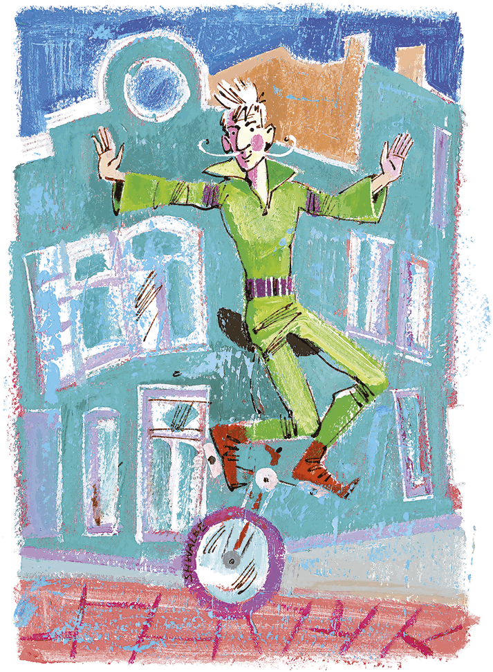 Коля отпрыгнул в сторону и увидел, что его догоняет странный старик. Старик ехал на одноколесном велосипеде, расставив руки для равновесия, будто цирковой акробат. Он и одет был, как акробат: в зеленое облегающее трико и красные мягкие тапочки с длинными, острыми, даже чуть свисающими вниз носками. У старика были седые волосы ежиком и длинные усы, тоже расставленные, наверно, для равновесия.