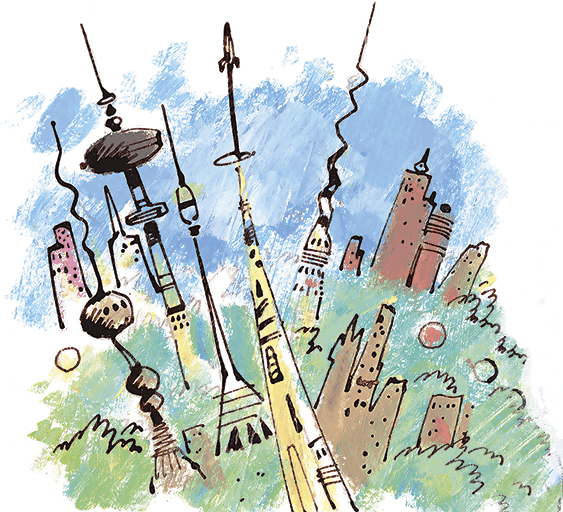 Коля обернулся и посмотрел на Москву. С высоты Москва казалась бесконечной и очень зеленой. Правда, угадать где что нелегко. Коля увидел телевизионную Останкинскую башню, но рядом с ней было еще три башни, вдвое выше, и они окружали старую башню, как здоровенные сыновья старенькую мамочку.