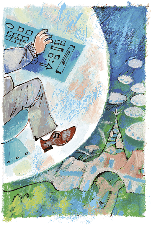 Вот и получилось, что, когда Коля добрался до пузыря, чтобы флипнуть до космодрома, он чувствовал себя тяжелым, как удав, который проглотил поросенка. Он опустился в кресло и, с трудом держа глаза открытыми, поглядел на пульт с кнопками. Все правильно. Под каждой написана улица или место: «Университет», «Красная площадь», «Сокольники» и так далее. Некоторые надписи ничего Коле не говорили: «Первый Костул», «Сад Они», «Сидоровский уровень». А вот то, что нужно. Даже больше, чем нужно: «Космодром-1», «Космодром-2», «Космодром-сортировочная» и даже «Космодром-учебный». Попробуем «Космодром-1», решил Коля. Он нажал на кнопку, и его пузырь не хуже других приподнялся над землей, быстро набрал скорость и понесся над улицей в потоке таких же пузырей. Коля понял, что движение подчиняется строгим правилам: пузыри друг дружке не мешали, на перекрестках те, что летели вдоль главной улицы, поднимались повыше и, словно по невидимому мосту, пролетали над теми, что подлетали сбоку. Некоторые из пузырей реяли высоко в небе, как детские воздушные шарики, а среди них иногда мелькали стрекозы – люди с крыльями. А еще выше проносились большие корабли, диски, кольца, шары…