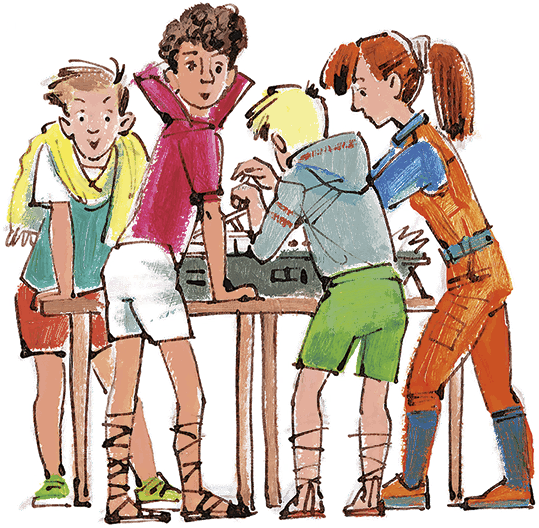 Коля заглянул внутрь. В большой комнате с выпуклым потолком стояло несколько ребят и девочек, некоторые постарше Коли, другие как он. Они сгрудились вокруг низкого стола, на котором стояло что-то. Если ты никогда вещь не видел и она необычной формы, то лучше назвать ее «что-то», никогда не ошибешься.