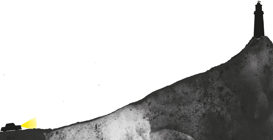 Как будто мы могли не заметить. Попробуй такое не заметь. Дорога заканчивалась ровной площадкой вроде парковки, только парковка эта была ничем не вымощенная и сильно заросшая. Дальше травянистый склон забирал опять круто вверх, и там, на вершине утёса, за которым берег обрывался и простиралось широкое качающееся море, в небо взмывала круглая белая с чёрным башня.