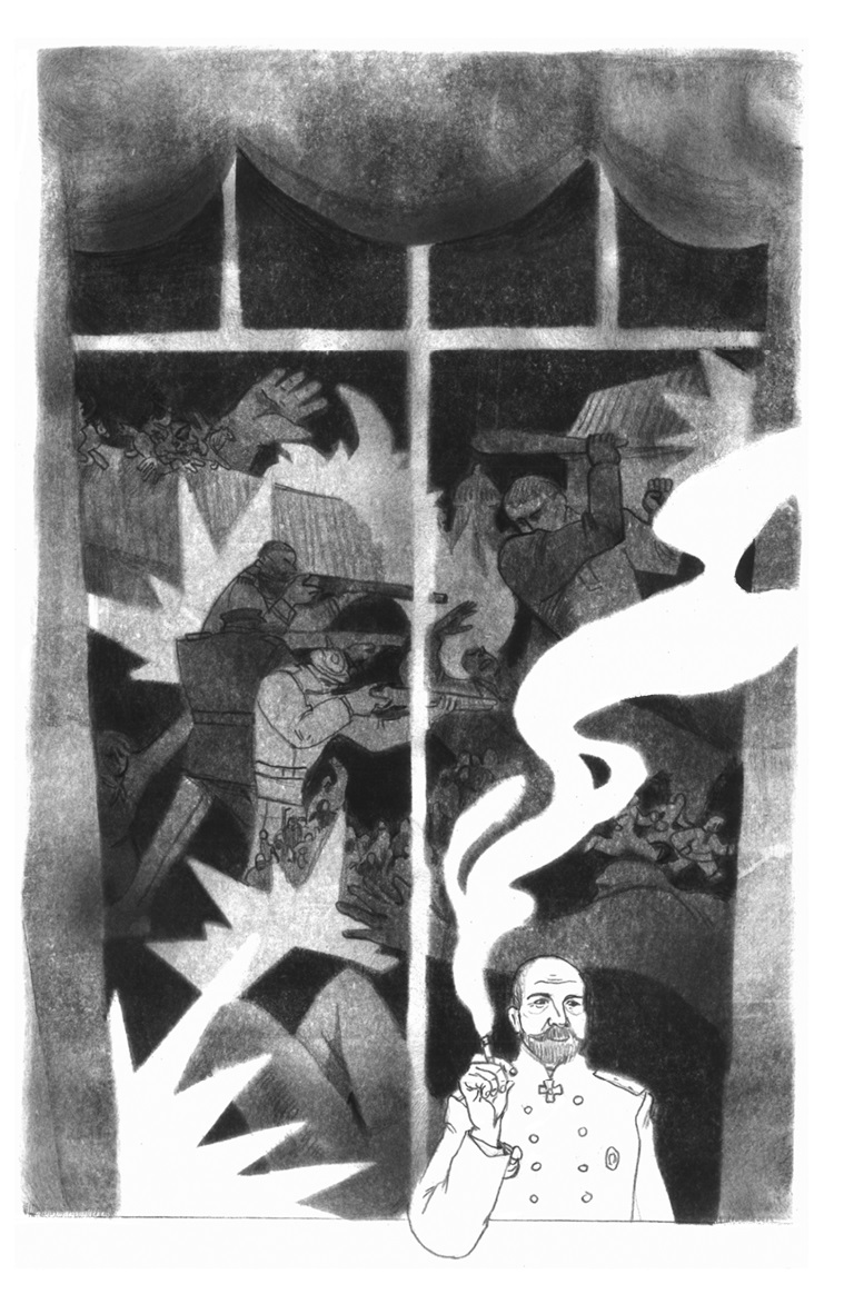 Невский проспект был запружен народом. Там было более сотни тысяч людей. Ими никто не руководил, но они шли к центру города, к Дворцовой площади. Литератор С. Р. Минцлов решил выйти посмотреть, что происходит. Он шел по Кирилловской улице, по которой валила с ближайших фабрик толпа. Казаки вынудили ее разойтись. Минцлов с приятелями свернул на боковые улицы. На Суворовском проспекте стояли отряды драгун. Перекрестки Невского охраняли пешие и конные заставы. Они развели костры и плясали вокруг них, спасаясь от холода. На 1‐й Рождественской улице были устроены походные кухни. Минцлов взял извозчика и направился к Адмиралтейству. Экипажей было много, они плелись друг за другом. Минцлов отпустил извозчика рядом с аркой Главного штаба и пошел в сторону Дворцовой площади, с трудом протискиваясь сквозь плотную толпу. Площадь была совершенно пуста. Только у дворца стояли войска. Выезды охраняли конногвардейцы. Минцлов решил направиться к Миллионной. Оттуда раздавались крики. Эскадрон обнажил палаши и поскакал в ту сторону. Минцлов только завернул за угол Невского. Позади раздались вопли. Извозчики, экипажи опрометью поскакали с Морской. Минцлов вжался в стену дома. Мимо него неслась толпа. Конногвардейцы расчистили арку и самое начало Морской улицы. Минцлов дошел до Полицейского моста. Тут раздался залп, затем другой. «Холостыми, холостыми палят», – заговорили кругом. Но стреляли не холостыми. На набережной Мойки было много рабочих. Раздавался свист и крики. Минцлов шел к Марсовому полю. За ним раздался крик. Кавалерия бросилась на мост. Толпа кинулась врассыпную.
