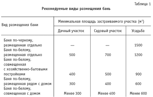 Перед началом строительства нужно тщательно продумать устройство и расположение бани. Следует отметить, что нормы на установку недымных бань отсутствуют. Исходя из размеров участка, отводимого под застройку, можно привести некоторые ориентировочные рекомендации по расположению банной конструкции (табл. 1).