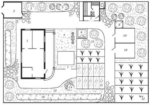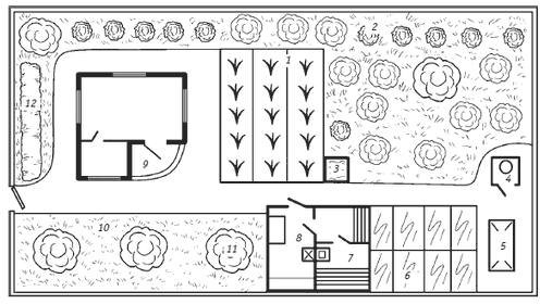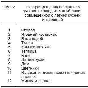 Неподалеку от бани расположен бассейн, в котором в теплое время года можно купать детей. Водой после купания можно поливать огород и деревья, которые также находятся рядом. Со стороны жилого дома крыша банного строения выступает на 1,5 м и таким образом образует навес над столом-верстаком. Пространство, находящееся под верстаком, можно использовать для хранения дров. Печь в бане отапливается из предбанника. Туалет находится сразу за баней. Такую баню можно топить круглый год. В связи с этим ее отдельное размещение и большие размеры весьма оправданы. На рисунке 2 представлен план размещения бани, совмещенной с кухней и теплицей, на участке площадью 500 м2.
