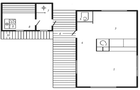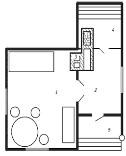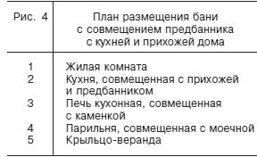 Баня, показанная на рисунке 4, является фактическим продолжением кухни – эти два помещения имеют общую печь и канализационную систему. Подобную баню можно использовать в любой момент. Печка в этом случае по своему устройству будет достаточно сложной, чтобы иметь возможность отдельного использования каменки и секции для обогрева дома.