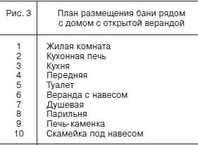 На рисунке 3 представлен план установки бани неподалеку от садового или дачного домика, в котором оборудована веранда с навесом.