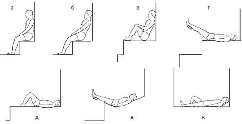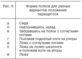 Следующей частью бани является парильня. Это важнейшее банное помещение должно быть таким, чтобы человек в нем чувствовал себя достаточно комфортно, его тело равномерно прогревалось, а также была возможность использовать веник. Размеры парильни принимаются в зависимости от того, сколько человек одновременно будут в ней мыться и в каком положении они будут располагаться на полке – сидя, полулежа или лежа, а также тип печи. Наименьшая ширина полка для сидения – 40 см, если сидеть на нем с поднятыми ногами, то – 90 см. Если на полке лежать с согнутыми ногами, то его длина должна равняться 150 см, если лежать с вытянутыми ногами, то – 180 см. Форма полка может быть самой различной – плоской, с упором для головы, в виде кресла-шезлонга (рис. 6).
