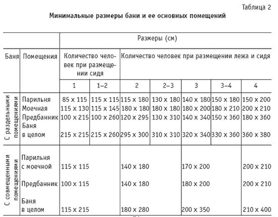 Минимальные размеры бани и помещений, предназначенных для мытья, указаны в таблице 2.