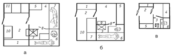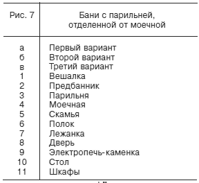 Третий вариант: в такой бане может париться лежа только один человек. Это позволяет сочетать банные процедуры с массажем в моечной. В предбаннике, ширина которого по плану составляет 180 см, можно установить стол, шкафы для одежды, посуды и топить печь отсюда, не входя в моечную. На рисунке 8 приведены конструкции бань, где парильня совмещена с моечной.