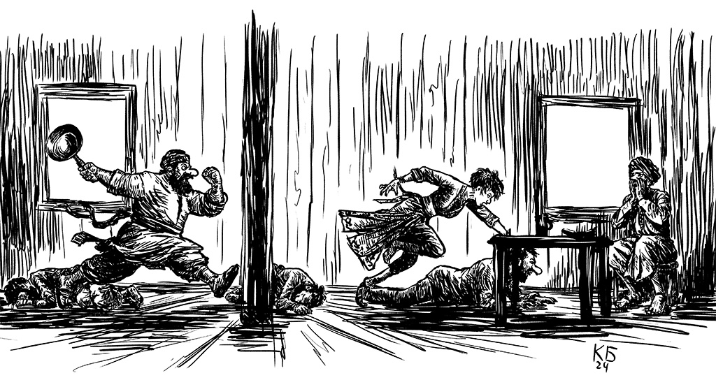 Повар покинул кабак и хлопнул дверью. Из-под завалов неспешно выбирались жертвы погрома. Кого-то вытягивали из обломков за руки. Потом собрались, отряхнулись и поковыляли в соседний кабак.