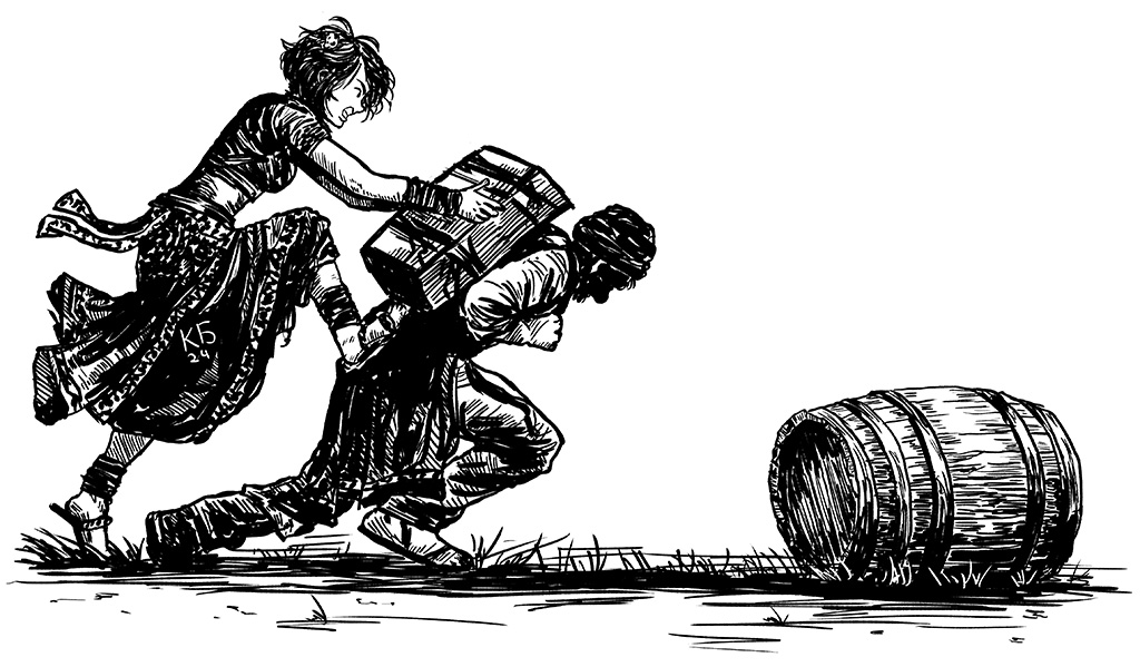 Два переплетенных в объятиях тела перевалились через перила и шлепнулись в грязь со второго этажа. Музыкант застонал, но скорее не от самого удара, а от того, что и несмотря на падение, девушка не выпустила из рук его намотанные на пальцы волосы. Она сопела, что-то там дергала и царапала, хоть и сама-то вряд ли понимала – что. В отчаянии музыкант сперва попытался поймать ее за руки, но сделал этим еще больнее. Тогда он вцепился в короткие темные волосы девушки и стал вазюкать ее голову по земле туда-сюда. Разбойница завопила от негодования, попробовала вырваться, вскочила на ноги – и все это не расцепляя рук, продолжая попытки свернуть музыканту шею или сорвать скальп. Он тоже привстал на колени, потом на ноги. В исступлении таская друг друга за волосы, они завертелись на месте в каком-то первобытном танце, наматывая неровные круги, и вдруг натолкнулись на торчащий посреди двора колодец…