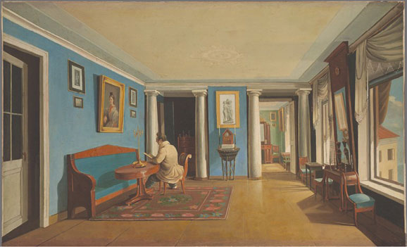 Капитон Алексеевич Зеленцов (1790–1845), художник-любитель и петербургский чиновник, нарисовал во второй половине 1820-х – начале 1830-х несколько картин под названием «В комнатах». Та, что описана выше, – не самая из них известная; в залах Третьяковской галереи большее внимание привлекает другая работа Зеленцова – на ней, отчего-то отдаленно напоминающей метафизическую пустоту жившего через сто лет де Кирико, представлены только две комнаты городской квартиры; персонаж там один, он сидит спиной к большому окну у противоположной стены, лицом к этой стене, в кресле у столика, и читает книгу. Зеленцов действительно любитель – его детали неуклюжи, а перспектива несколько искажена, однако эта живопись производит большое, огромное впечатление. Нужно только остановиться, всмотреться и подумать.