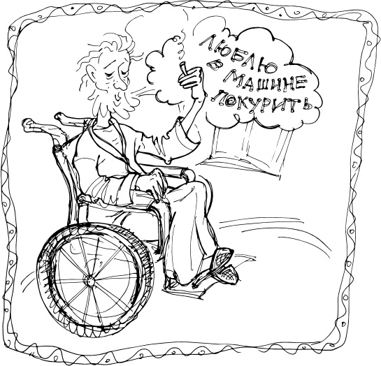 Папа с удовольствием выпустил дым и затушил сигарету о колесо каталки.