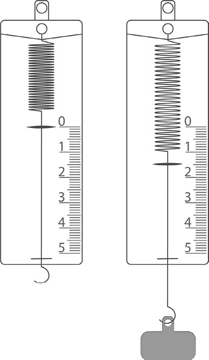 Рассмотрим еще один пример. Если взять металлическую пружину и подвесить к ней небольшой груз, т. е. подействовать на один из ее концов силой, равной весу груза, то пружина растянется. Причем (и это экспериментальный факт) величина деформации пружины пропорциональна весу груза: если мы подвесим груз в два раза тяжелее, то пружина растянется в два раза больше, а если подвесить груз в пять раз легче, то пружина растянется в пять раз меньше. Этот закон в 1660 году открыл английский ученый Роберт Гук (1635–1703), благодаря чему у физиков появилась возможность измерять величину абсолютно любой силы. Для этого достаточно приложить измеряемую силу к одному из концов пружины и измерить, насколько деформировалась эта пружина. Такой прибор называется динамометр, а принцип его работы лежит в основе конструкции практически всех весов[2], которые на самом деле измеряют не массу тела, а его вес, т. е. силу притяжения со стороны Земли.