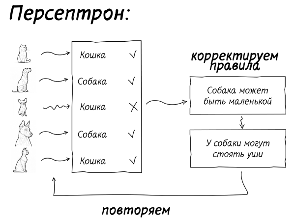Первой практической реализацией концепции искусственного нейрона стал персептрон . Его разработал американский психолог Фрэнк Розенблатт, который стремился воссоздать процесс обработки информации в мозге с помощью машин. Он предположил, что сети из персептронов так же, как нейронные сети головного мозга, могут обучаться и решать практические задачи. Для этого разработчику нужно «скормить» программе определенные данные и направить ее «мысли» в нужное русло. Розенблатт предложил алгоритм обучения персептронов и по сути сформировал набор инструкций, которые помогали программе учиться выполнять новые задачи. То есть машину можно было обучить, скажем, различать спелые и недозрелые бананы по косвенным признакам: цвету кожуры и наличию пятен. Он доказал эту теорию, разработав на основе нейросетей вычислительную систему «Марк‑1». Она могла распознавать лишь буквы и цифры, но Розенблатт был уверен, что со временем искусственные нейронные сети смогут выполнять более сложные задачи: распознавать изображения, речь и многое другое. И оказался прав!