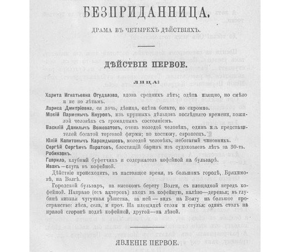Наконец, давайте вспомним, что писал Иоанн Богослов в 18-й главе своего Откровения: «Пал, пал Вавилон, великая блудница, сделался жилищем бесов и пристанищем всякому нечистому духу». Это я исключительно к тому, что искренне ненавижу последствия реформы русского языка Луначарского и потому тоже совершенно сознательно следую дореволюционному правилу русской грамматики, которое гласило, что существуют приставки «без» и «через», но нет приставки «бес». В подтверждение своих слов привожу обложку прижизненного издания знаменитой пьесы Александра Николаевича Островского. У бедной девушки не было приданого, она была без приданого, то есть безприданница. Пора перестать называть человека безчестного – честным бесом, а безсердечного – бесом сердечным. Конечно, право ваше, но своё я оставляю за собой.