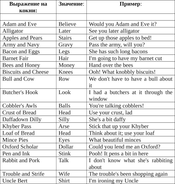 Иногда, чтобы нас окончательно запутать, кокни используют вместо одного слова только часть заменяющего его выражения. Например, «голову» (head) они запросто называют не в рифму «буханкой» (loaf), поскольку эквивалентом «head» считается сочетание «loaf of bread». Точно также не стоит удивляться, если вы услышите, как ступеньки (stairs) называют яблоками (apples), поскольку вообще-то полная их замена на кокни – «apples and pears» (яблоки и груши).