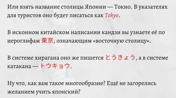 Вот вам типичный пример, где упоминается имя английской бегуньи и европейская мера длины. Первые пять значков (до запятой) написаны катаканой и означают фамилию Рэдклифф (Радокурифу). Дальше четыре значка читаются как «марасон» и обозначают заимствованное слово «марафон». Затем, как вы сами видите, идут полноценные китайские иероглифы (системы кандзи), заканчивающиеся упрощенными закорючками хираганы, используемой для связи слов через окончания. Также вы не можете не заметить понятную нам арабскую цифру «1» и латинскую букву «m». Всё это безобразие по-японски читается как Радокурифу Марасон горин дайхьё ни, ити-ман мэтору суцудзё ни мо фукуми, а означает всего-навсего «Рэдклифф намекает, что может принять участие в Олимпиаде как на дистанции 10 000 метров, так и в марафоне».