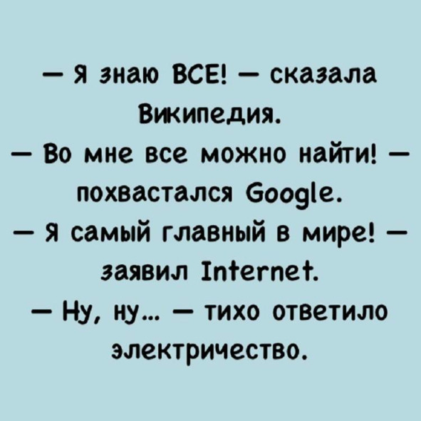– Я у вас вчера лампочку энергосберегающую покупал. – Да-да, помню, как же. – Так вот, принес я ее домой, ввернул в плафон – а она не горит! – А вы что хотели? Она же энергосберегающая, вот энергию и бережет.