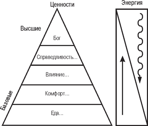 Но вот энергия, то есть поведение людей, направляется от пирамиды потребностей к пирамиде ценностей, может идти и с верхних уровней на нижние, и с нижних на верхние, и с нижних на нижние, и с верхних на верхние. Словом, как угодно.