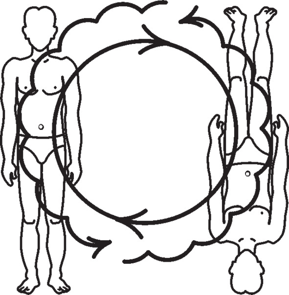 Сам цикл ясно виден на рисунке: люди на роднике и люди не на роднике связаны нитями восходящего и нисходящего потока, причём в связи родник – посторонние преобладает нисходящий поток, а в связи посторонние – родник больше потока восходящего. При этом, поскольку в каждой точке энергообмена один поток поглощается, а другой после этого излучается, то нетрудно заметить, что оба потока движутся в логически противоположных курсах, как бы в разных направлениях во времени.