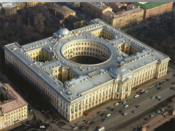 Строительство началось в 1763 году и завершилось в 1788 году. Помимо очевидных элементов классицизма (вход строго по центру, «большой ордер», ризалиты, окна больших размеров, строгая симметрия) «проглядывали» и элементы барокко: купол сложной формы, пластичные контуры центральной части фасада. При первом знакомстве с Академией художеств сложно поверить, что монументальное прямоугольное здание скрывает внутри круглый двор диаметром 55 метров. Это символическая отсылка к Мекке классицизма – шедеврам античного Рима. В двор такого размера можно виртуально вписать древнеримский Пантеон, а по замыслу императрицы круглая форма должна была ассоциироваться с собором Святого Петра как совершенным образцом искусства и эталоном для учащихся Академии. Известно, что первоначальный проект Жана-Батиста-Мишеля имел еще более явные отсылки к античному Риму, так как содержал колоннаду гигантского ордера вместо пилястр.