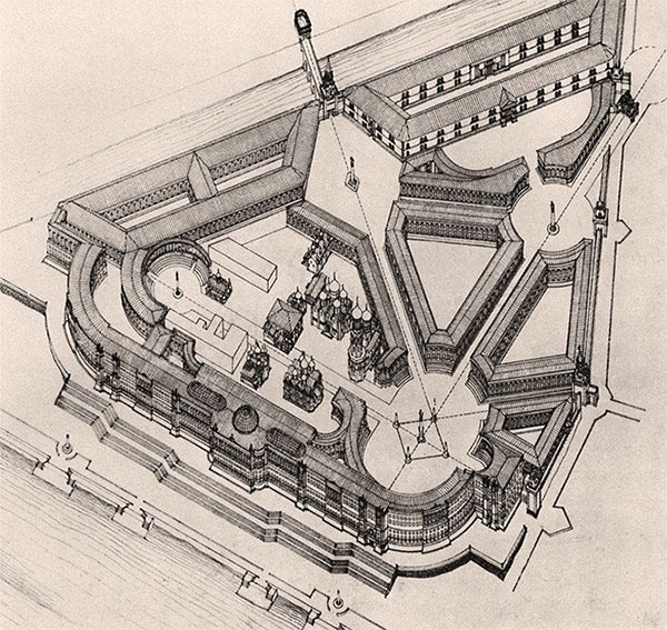 Самым масштабным проектом Баженова по поручению Екатерины Великой была перестройка Кремля. Воодушевленный архитектор был готов снести немало исторических построек ради воплощения своего замысла – метаморфозы Кремля из защитного сооружения в гражданский центр столицы империи в духе античного форума. В проект Баженова входила постройка царских покоев, овальной площади для народных собраний в центре нового Кремля, Коллегии, театра, арсенала. При этом старинные строения Кремля, не подлежащие сносу, должны были оказаться во внутренних дворах новых строений.