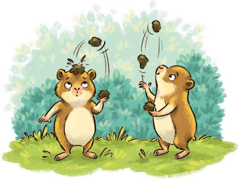 Зик слепил из земли комочки и начал ими жонглировать. При этом он корчил смешные гримасы. Зак рассмеялся и занялся тем же. Один комочек упал ему на голову и рассыпался, замарав шёрстку. Зик не смог сдержать смеха. Заку не понравилось, что брат смеётся над его неудачей, и он запустил в Зика комочком земли, попав прямо в животик. Зик бросил комочек в ответ. Каждый раз, когда один из братьев попадал в другого, раздавались восторженные возгласы.