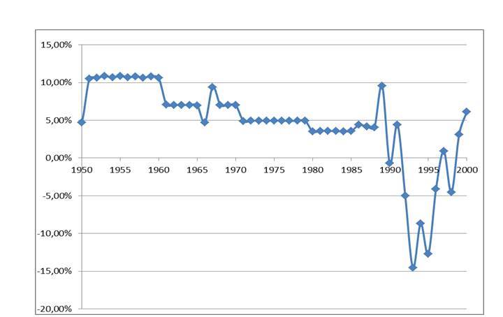 У меня есть возможность показать график темпов роста внутреннего промышленного продукта СССР с 50-х годов до 2000 г.[5], см. рисунок).