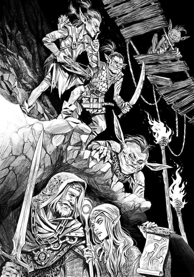 Гоблины могут отличить существо, которое потерялось в темноте, от того, которое обладает темным зрением. Они не будут нападать на второе вблизи, если смогут этого избежать, – уж лучше стрелять из коротких луков. Однако в узких пещерных проходах не всегда возможно наметить хорошую линию прицела и рукопашный бой может быть единственным вариантом атаки. В таком случае гоблины опираются на знание местности, чтобы заставить отряд растянуться: ведущий гоблин может атаковать скимитаром (действие), совершить Отход (бонусное действие), а затем отступить по коридору (перемещение), пока не выйдет в более открытую пещеру, где он и несколько других гоблинов нападут на первого появившегося персонажа, используя подготовленные действия атаки. А пока персонажей заманивают вперед, другие гоблины могут при случае стрелять в них или наносить колющие удары из боковых проходов по пути.