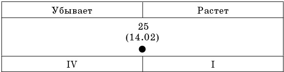 Новолуние будет 25-го, в 14 часов 2 минуты по московскому времени. Римская цифра IV в нижней строке обозначает четвертую фазу Луны (до новолуния), а цифра I – первую фазу Луны, которая всегда начинается сразу после новолуния. В верхней строке указан характер Луны (убывает до новолуния и растет после него).