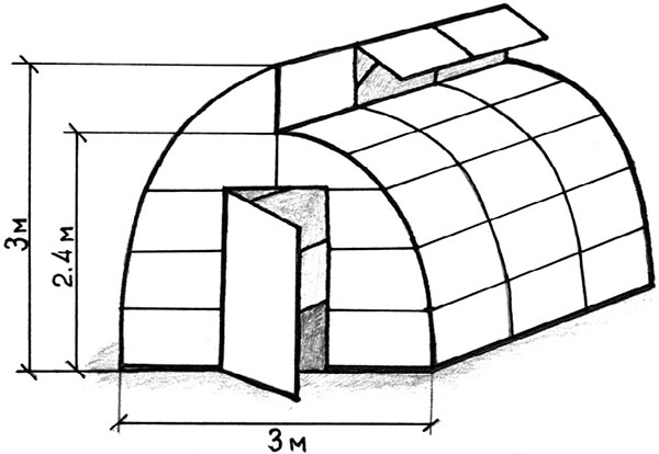 Кроме коньковых и арочных теплиц несколько лет тому назад были созданы купольные теплицы (рис. 3а). Их легко сделать самим из толстой арматуры, которая продается в любом строительном магазине. Потребуется всего три прутка, они обычно имеют шестиметровую длину. Два человека берут их за концы и начинают сходиться, получаются дуги. Начертив на земле круг нужного диаметра, равномерно втыкаете их по окружности в почву примерно на глубину 40–50 см. Можно и менее глубоко, но при условии, что вы выкопаете неглубокие ямки, в которые воткнете концы прутков и зальете их раствором цемента (используя, как обычно, цемент и песок в пропорции 1:3 и воду до консистенции густой сметаны). Получается каркас из шести дуг. На них набрасываете лутрасил или пленку и обвязываете основание веревкой, чтобы укрытие не раздувал ветер. Теплица готова. Но эти теплицы не получили широкого распространения, поскольку площадь под ними эффективно использовать невозможно (рис. 3б