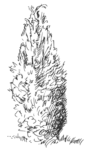 Таким образом, ярусы горизонтальных веток будут расположены близко друг к другу, и елочка станет очень густой, а главное – этот простой, но ежегодный прием не даст елкам вымахать до небес. Кроме того, мой опыт показывает, что густо посаженные ели (если их не укорачивать) начинают терять нижние ветки. И со временем вместо зеленой ограды вырастает колоннада из голых в нижней части стволов.
