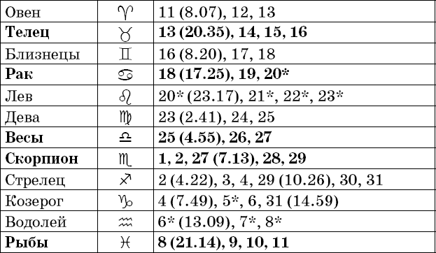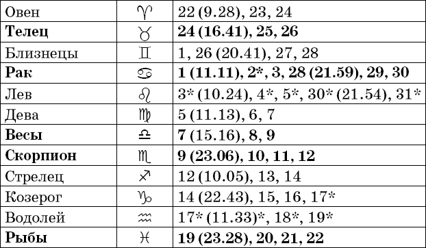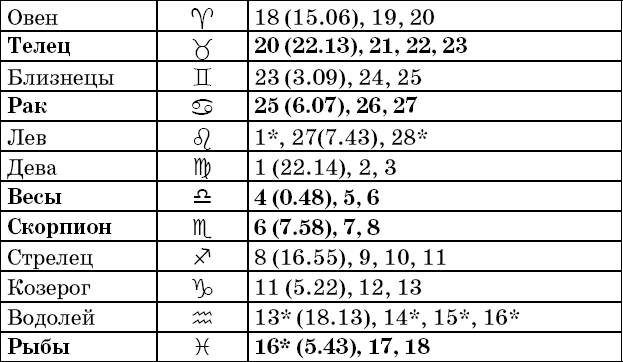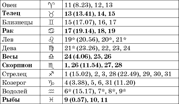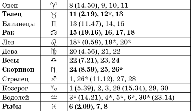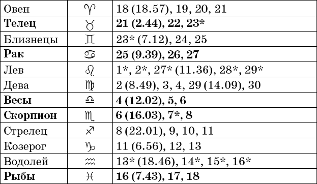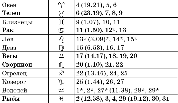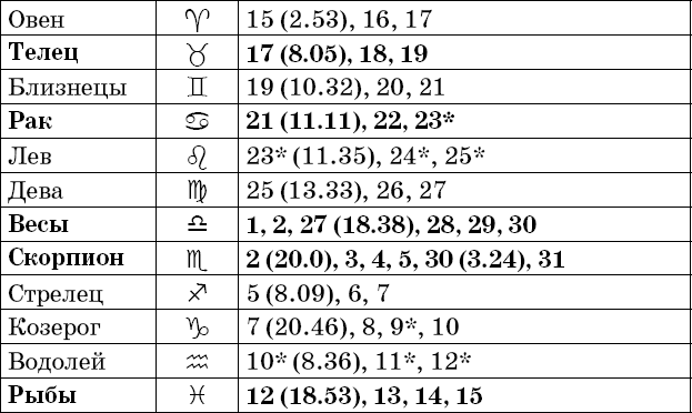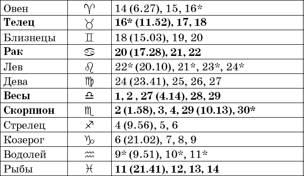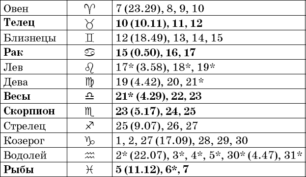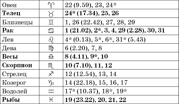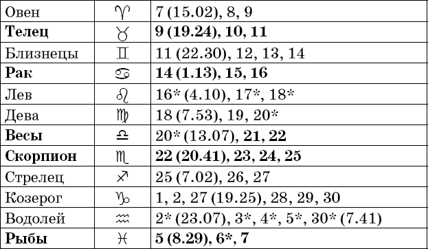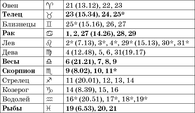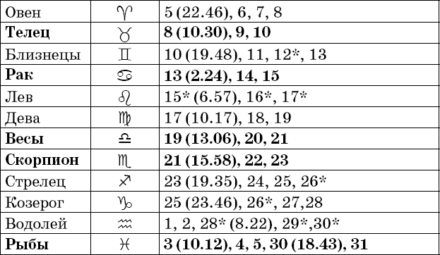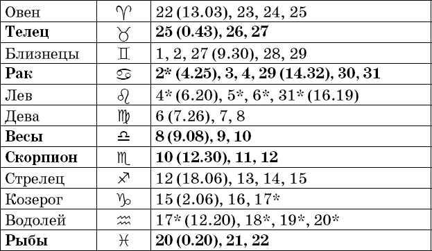 Звездочкой отмечены дни, которые в настоящее время считаются неблагоприятными. Кроме того, звездочка стоит у дней новолуния и полнолуния: за 12 часов до их наступления и 12 часов после них не рекомендуется сажать и сеять. Для овощей все дни, когда Луна находится в знаке Льва, а для всех растений – дни Водолея тоже считаются неподходящими, и они соответственно помечены звездочкой.