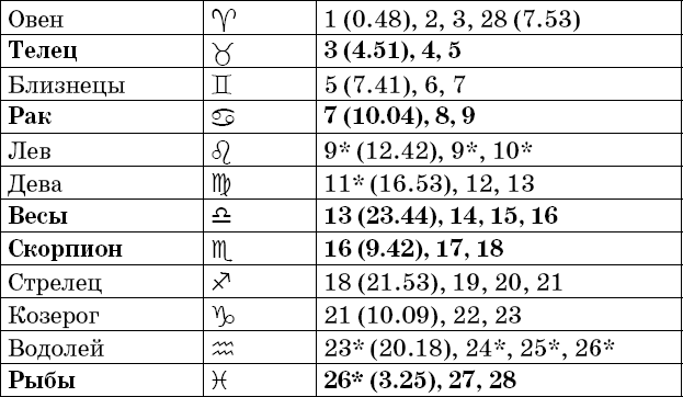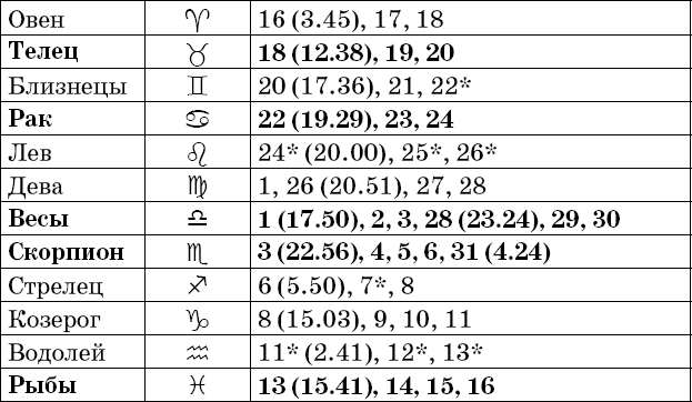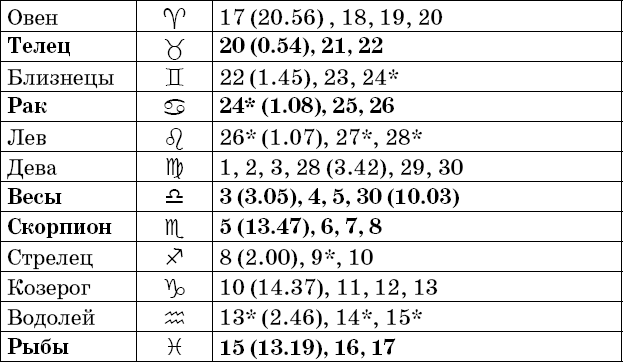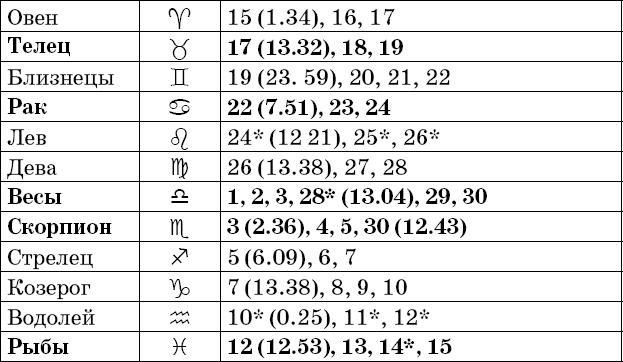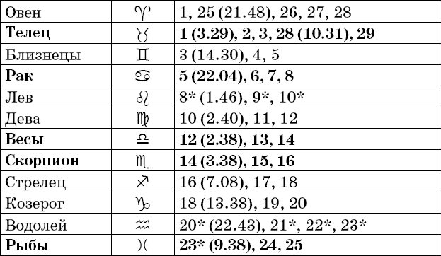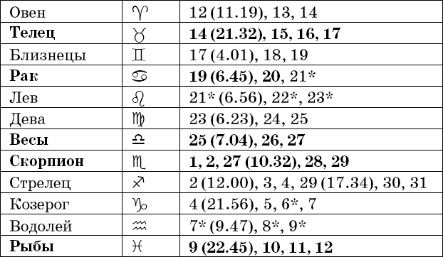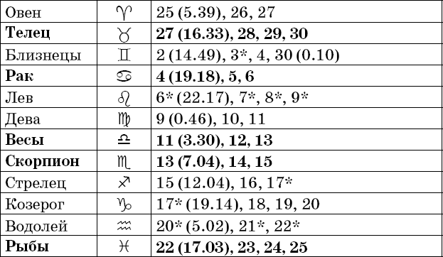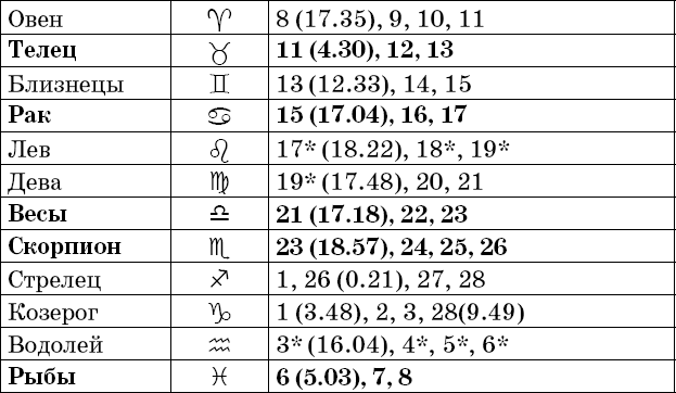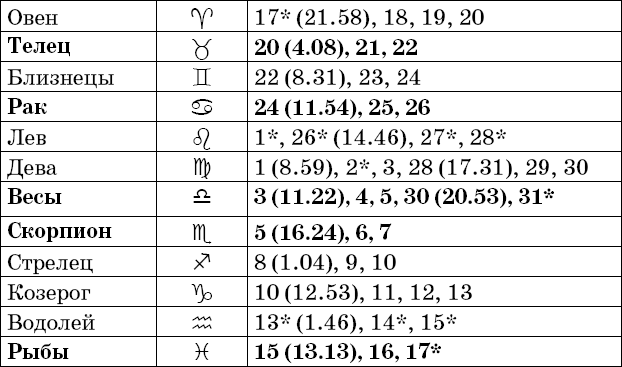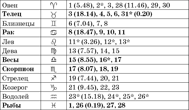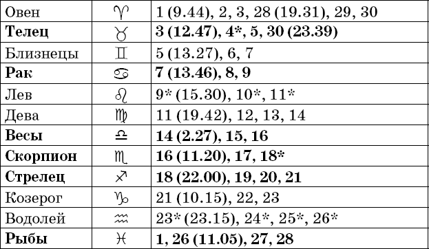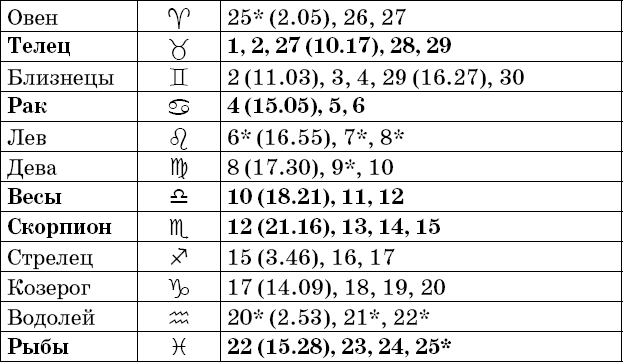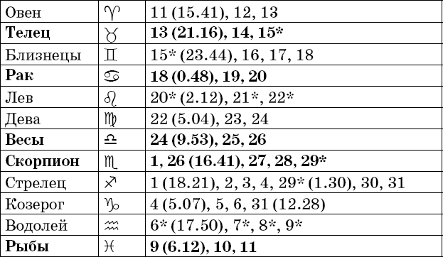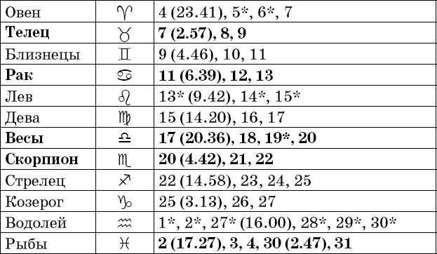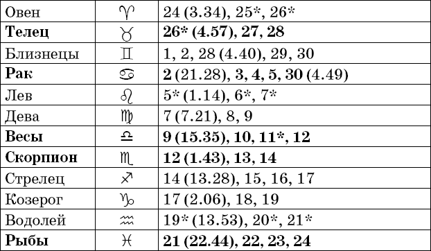 Звездочкой отмечены дни, которые в настоящее время считаются неблагоприятными. Кроме того, звездочка стоит у дней новолуния и полнолуния: за 12 часов до их наступления и 12 часов после них не рекомендуется сажать и сеять. Для овощей все дни, когда Луна находится в знаке Льва, а для всех растений – дни Водолея тоже считаются неподходящими, и они соответственно помечены звездочкой.