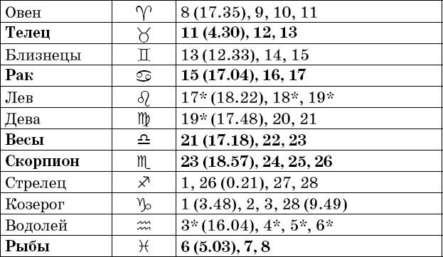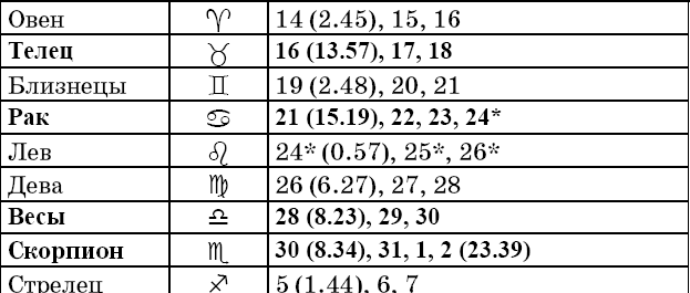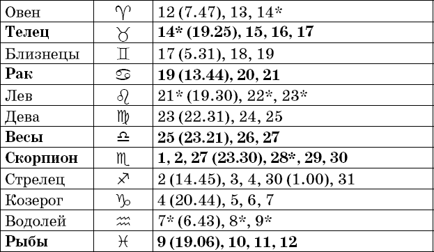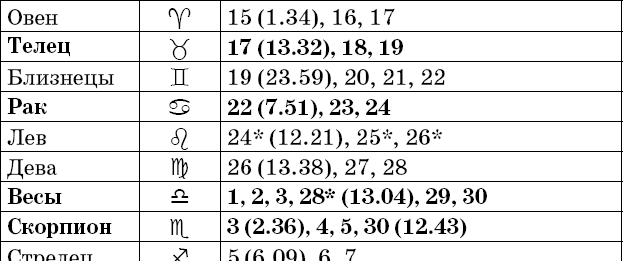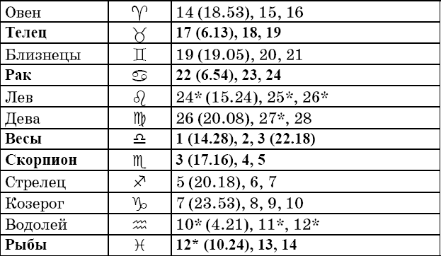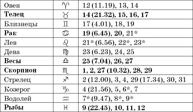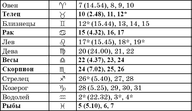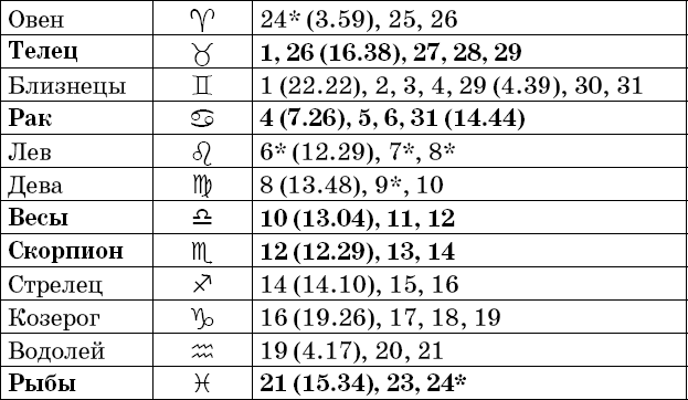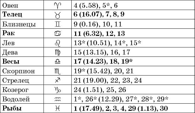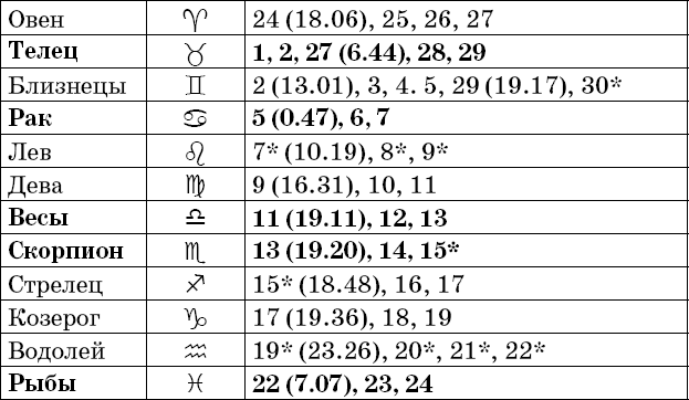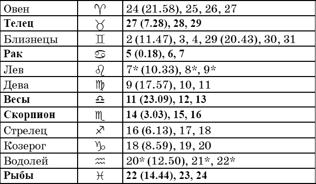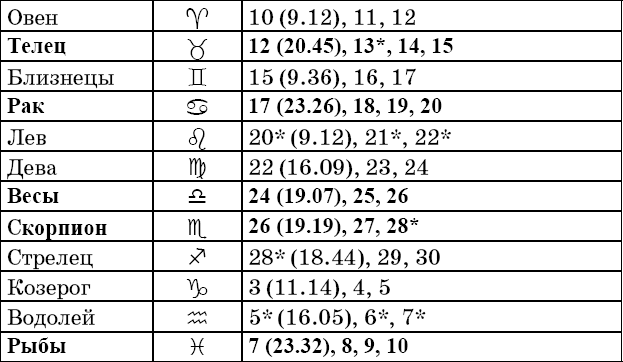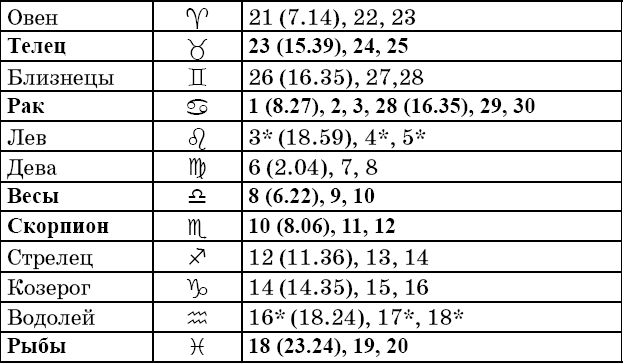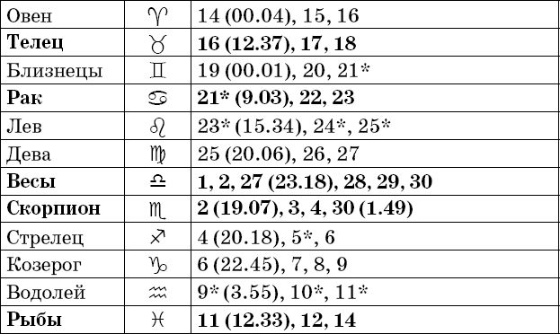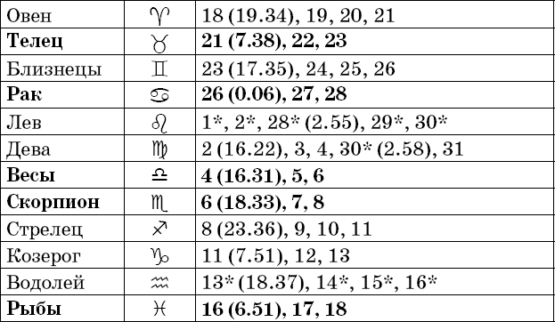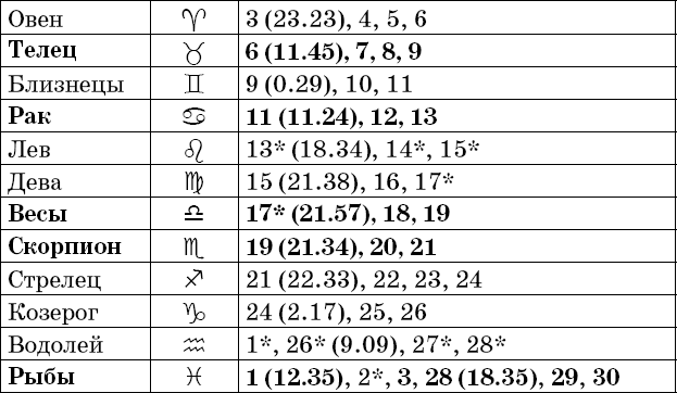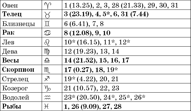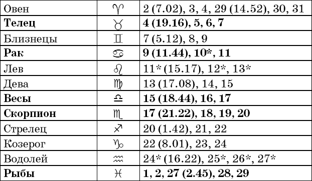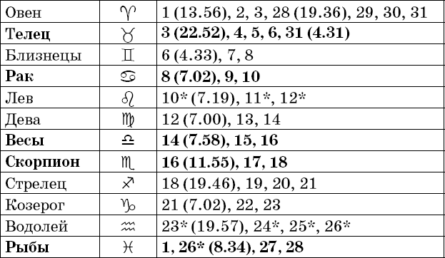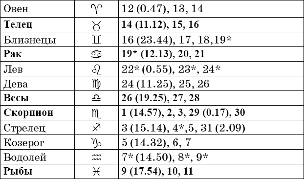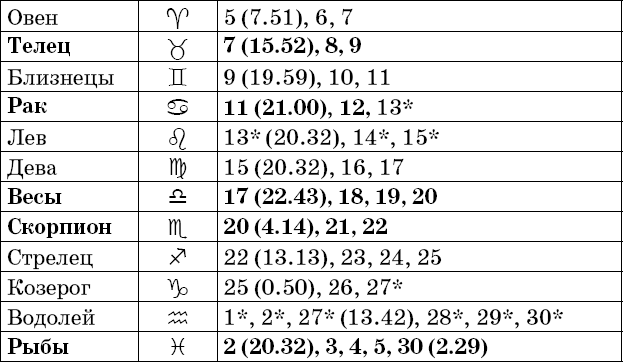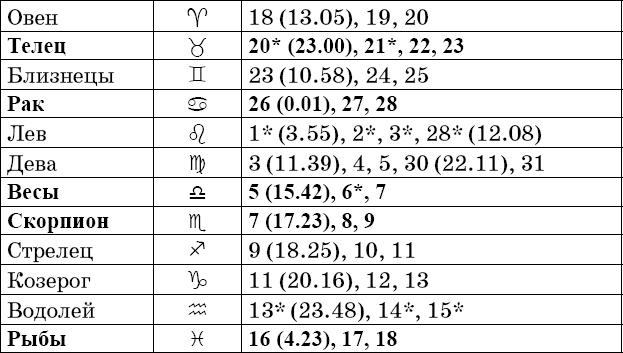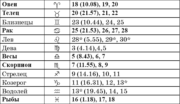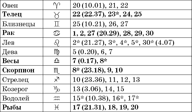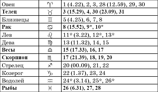 Звездочкой отмечены дни, которые в настоящее время считаются неблагоприятными. Кроме того, звездочка стоит у дней новолуния и полнолуния: за 12 часов до их наступления и 12 часов после них не рекомендуется сажать и сеять. Для овощей все дни, когда Луна находится в знаке Льва, а для всех растений – дни Водолея тоже считаются неподходящими, и они соответственно помечены звездочкой.