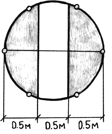 Кроме коньковых и арочных теплиц несколько лет тому назад были созданы купольные теплицы (рис. 3а). Их легко сделать самим из толстой арматуры, которая продается в любом строительном магазине. Потребуется всего три прутка, они обычно имеют шестиметровую длину. Два человека берут их за концы и начинают сходиться, получаются дуги. Начертив на земле круг нужного диаметра, равномерно втыкаете их по окружности в почву примерно на глубину 40–50 см. Можно и менее глубоко, но при условии, что вы выкопаете неглубокие ямки, в которые воткнете концы прутков и зальете их раствором цемента (используя, как обычно, цемент и песок в пропорции 1:3 и воду до консистенции густой сметаны). Получается каркас из шести дуг. На них набрасываете лутрасил или пленку и обвязываете основание веревкой, чтобы укрытие не раздувал ветер. Теплица готова. Но эти теплицы не получили широкого распространения, поскольку площадь под ними эффективно использовать невозможно (рис. 3б). При радиусе круга 75 см площадь его окажется около 1,66 кв.м. Если при этом сделать проход 50 см шириной, то получится всего две полукруглых малопродуктивных грядки. И хотя освещенность в них максимальная и снег скатывается с них самостоятельно, купольные теплицы на садовых участках не прижились.
