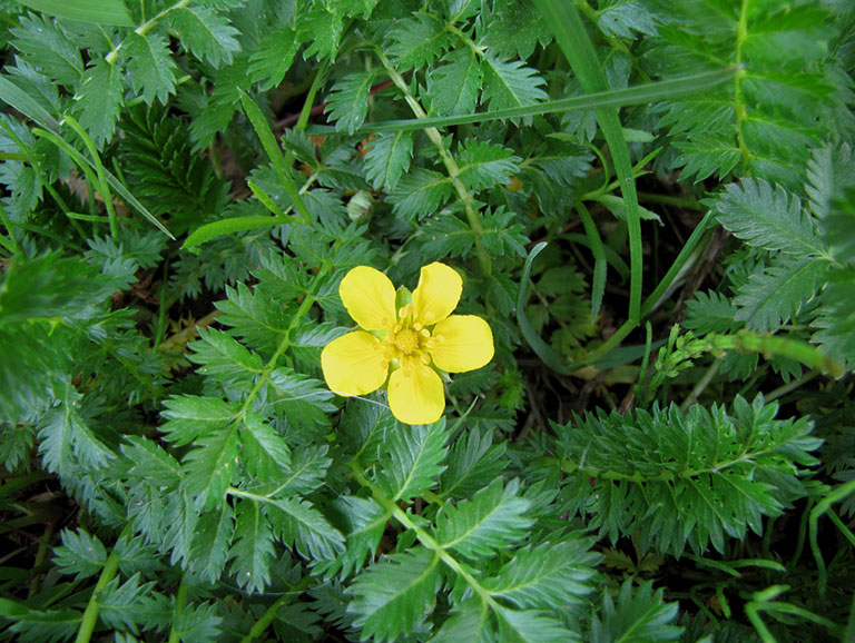 У этой лапчатки прямостоячий слегка волосистый стебель высотой 20–40 см. Листья пятилопастные надрезанные пильчатые. Цветки одиночные на длинных цветоножках, состоят из четырех желтых лепестков с красным пятнышком при основании. Растет повсеместно на увлажненных почвах. Ценность представляет корневище – толстое цилиндрическое с многочисленными тонкими придаточными корешками. Его особенностью является красный цвет на разрезе. Его выкапывают ранней весной (с осени пометив место его нахождения) или осенью, еще до отмирания надземной части. Корень обладает сильно выраженным вяжущим свойством, поэтому отвар корня употребляют при поносах и дизентерии.