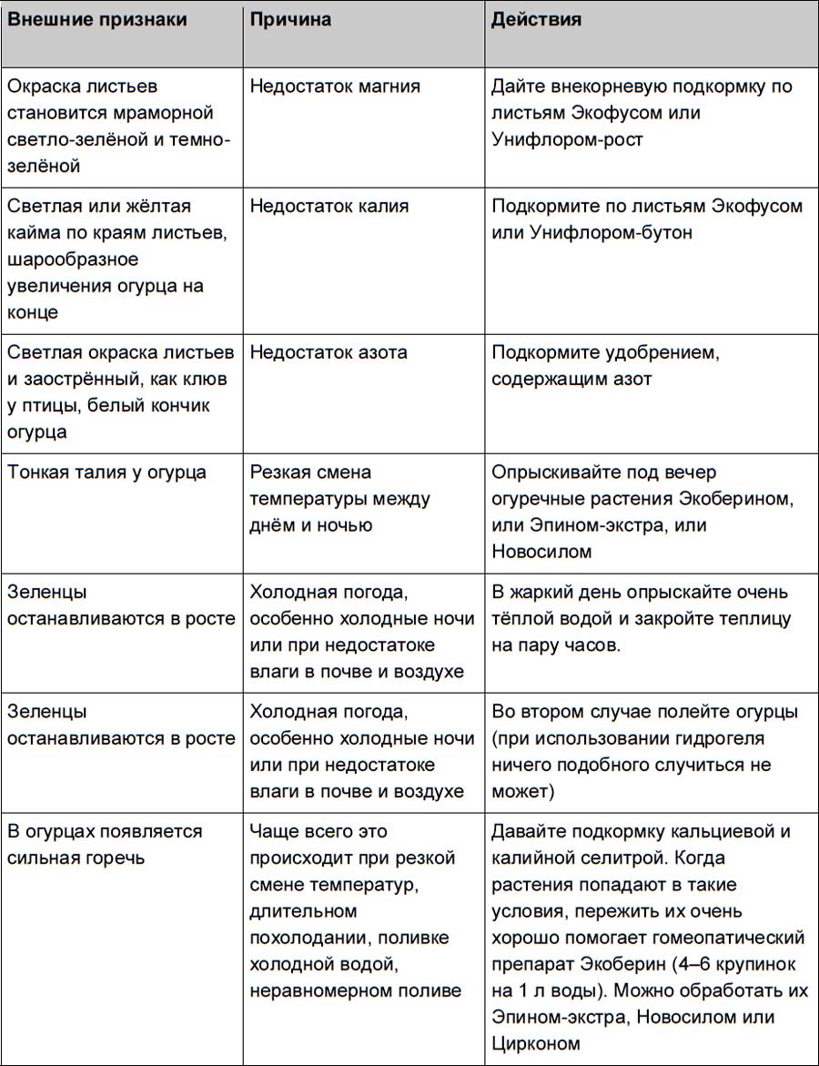 Огурцы не любят кислую, плотную, бедную, холодную почву, поливы холодной водой (ниже 20 °C), сквозняки, резкую смену температур днём и ночью (начинают горчить), холодные ночи (ночью температура не должна опускаться ниже 12–16 °C, иначе зеленцы не растут). В дневное время огурец предпочитает температуру 22–28 °C. Рост и развитие огурца замедляются при температуре ниже 20 °C, при температуре выше 32 °C – приостанавливаются, а при температуре выше 36–38 °C не происходит опыления.