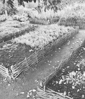 Особенно красиво выглядят окантовки в виде плетня (рис. 7). Плетень повыше может превосходно отделить огород от зоны отдыха. Особенно если сразу за плетнем перед огородом высадить подсолнухи или кукурузу, либо посеять семена космеи. Перед плетнем со стороны участка можно посадить тыквы, плети которых пустить по плетню сверху. Можно в плетне сделать проем для арки-входа в зону огорода и высадить с двух сторон от арки тыквы или кабачки, запустив их плети по арке. Право же, это выглядит очень эффектно. Можно отделить регулярный огород перголой, по которой запустить фасоль (в том числе и декоративную) или горох совместно с душистым.