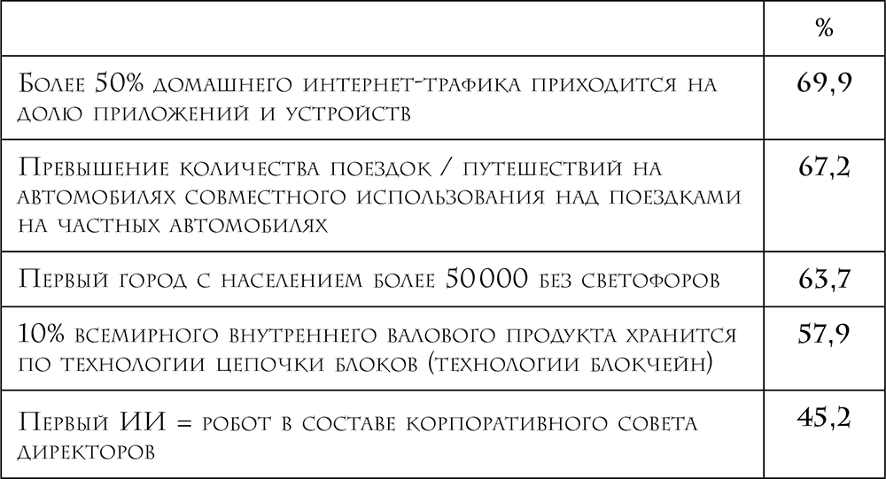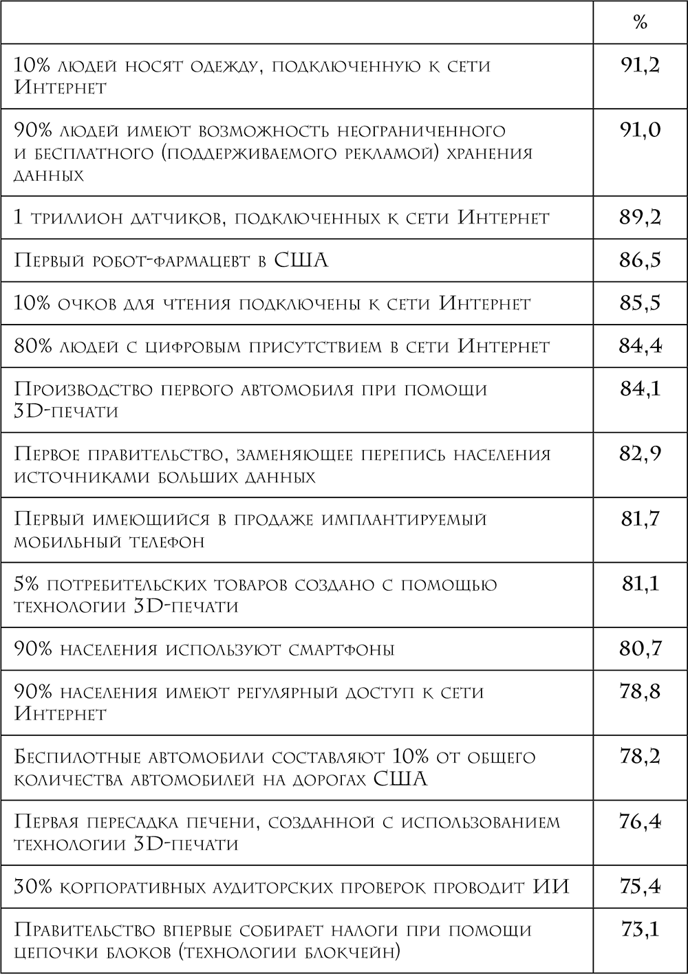 Отчет Всемирного экономического форума, опубликованный в сентябре 2015 года, выявил двадцать один поворотный момент (точку, в которой конкретный технологический сдвиг принимается основной частью общества), который формирует будущий цифровой гиперподключенный мир[14]. И все эти моменты ожидаются уже в ближайшие десять лет. Именно они наглядно отразят те глубинные изменения, которые будут вызваны четвертой промышленной революцией. Переломные моменты были выявлены в результате исследования, проведенного Международным экспертным советом Всемирного экономического форума по вопросам будущего программного обеспечения и общества, в котором участвовали восемьсот руководителей и экспертов отрасли информационных и коммуникационных технологий.