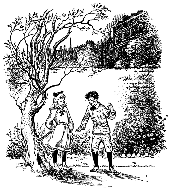 Жила она в одном из домов, стоявших тесным рядом. Как-то утром она вышла в крошечный садик позади дома, и мальчик из соседнего садика подошёл к самой изгороди. Полли удивилась: до сих пор в том доме детей не было, там жили мисс и мистер Кеттерли, старая дева и старый холостяк. И вот Полли удивлённо посмотрела на мальчика. Лицо у него было грязное, словно он копался в земле, потом плакал, потом утёрся рукой. Примерно это, надо сказать, он и делал.